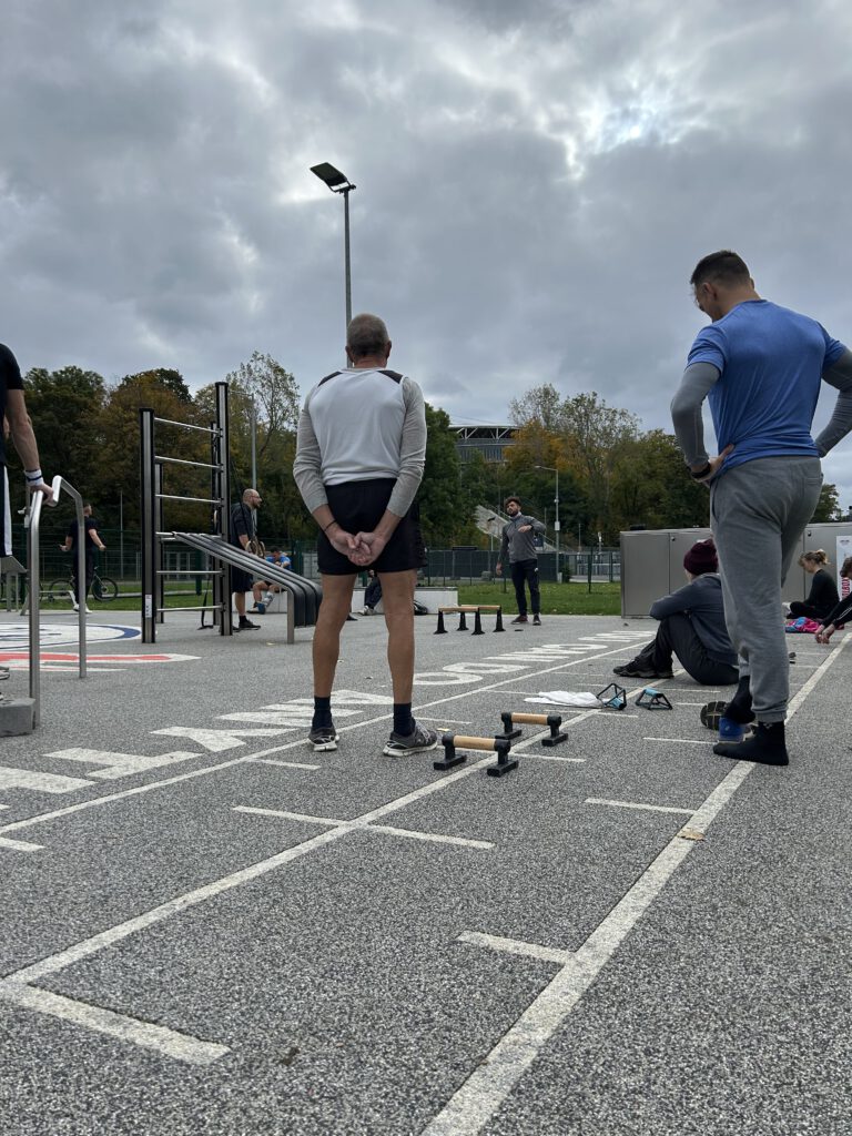 Zum Training: Nach einer gemeinsam geleiteten Erwärmung, wird der Fokus meist auf Skilltraining (Handstand, Muscle-ups, etc.) gelegt. Im Anschluss trainiert jeder auf seinem Level z.B. in einem Zirkeltraining. Vor Beginn werden alle Übungen gemeinsam durchgegangen und verschiedene Level demonstriert. Während des Trainings helfen die Fortgeschrittenen den Beginnern und sind Ansprechpartner bei Fragen.